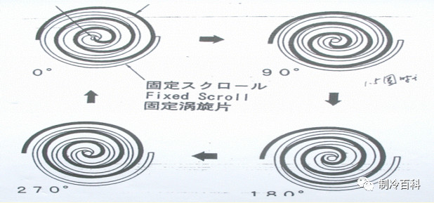 涡旋式压缩机主要由两个涡旋盘相错180度对置而成,其中一个是固定涡旋盘,而另一个侧是运动涡旋盘,它们在几点上接触并形成一系列月牙形容积。运动涡旋盘一方面为了与固定涡旋盘啮合而保持给定的旋转半径,另一方面做不自转的旋转运动,这是靠安装在动、静涡旋盘之间的十字滑环来保证。吸气口在涡旋盘的外表面,随着曲面的顺时针转动,气体由边缘吸入,进入月牙形容积,并在顺向中心运动的同时,使月牙形容积逐渐缩小而压缩气体.