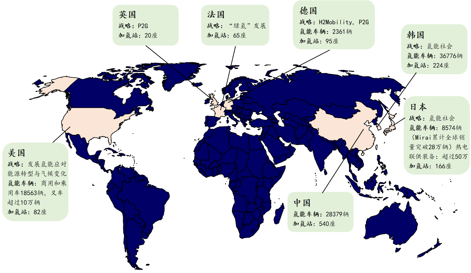 在应用方面,氢能仍主要作为原料用于工业领域,全球合成氨、合成甲醇、炼化和冶金、供热等其他领域年氢气消费量分别约3200万吨、1750万吨、4300万吨和1300万吨。交通领域,燃料电池汽车与加氢站加速建设,全球在营加氢站总数超1200座,同比增长超30%,主要国家燃料电池汽车保有量超过9万辆,同比增长超11%,全球主要国家的应用现状见图1。