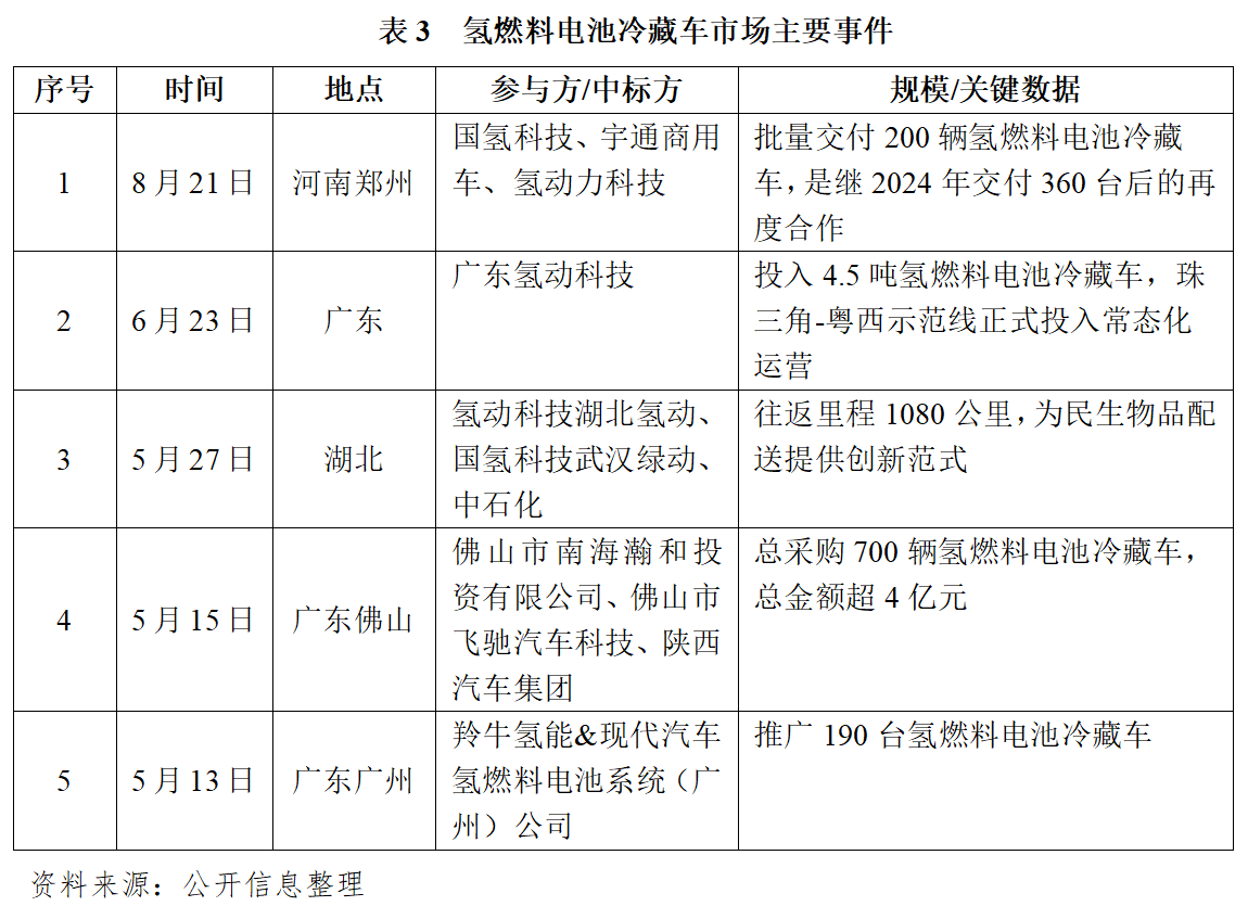 同时,随着燃料电池技术的迭代升级、基础设施的不断完善与商业模式的不断创新,氢燃料电池冷藏车增长较为迅速。据中物联冷链委数据显示,2024年我国氢燃料电池冷藏车销量为1300辆,同比增长33.47%。目前,氢燃料电池冷藏车的试点示范与商业化应用正在稳步推进。多家企业已完成产品布局并投入市场,在部分区域初步实现了规模化运营,近期市场主要事件详见下表3。