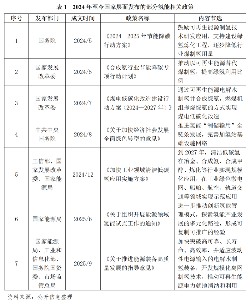 近年来,我国的氢能宏观战略地位不断增强,在多领域迎来应用发展机遇。国家层面,《氢能产业发展中⻓期规划(2021—2035年)》,提出氢能是“未来国家能源体系的重要组成部分”“用能终端实现绿色低碳转型的重要载体”。2024年,氢能作为前沿新兴产业列入政府工作任务,并被写入《中华人民共和国能源法》,2024年至今国家层面发布的部分氢能相关政策见表1。地方层面,截至2024年,全国累计发布氢能专项政策超560项,因地制宜推进氢能产业发展。其中,山东、陕西、吉林、四川、湖北以及内蒙古鄂尔多斯、山西吕梁等地相继出台氢能车辆高速通行费减免支持措施。