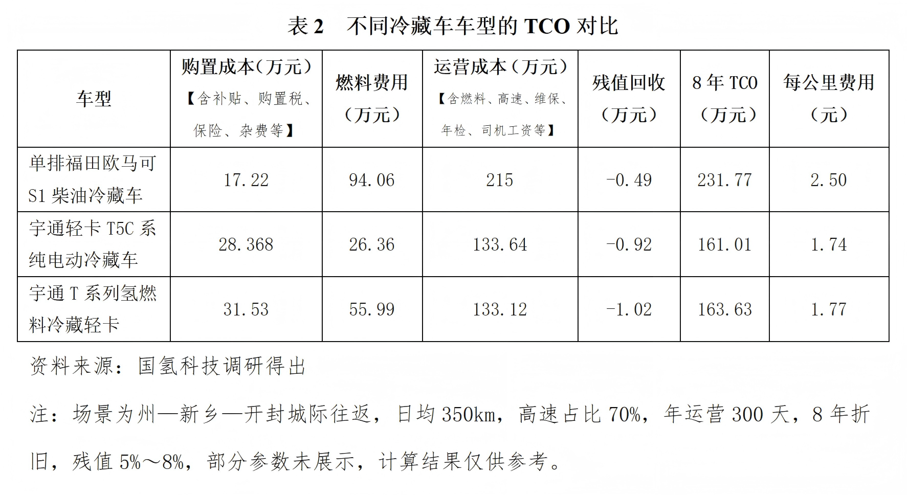 当前,氢燃料电池冷藏车的全生命周期成本(TCO)正快速逼近纯电动冷藏车。燃油、纯电动和氢燃料电池冷藏车的TCO对比见表2。叠加未来各地政府的购车补贴、运营补贴、加氢站建设补贴等组合拳政策,氢能冷藏车在成本上的优势将越来越明显。