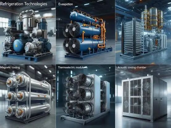 蒸气压缩制冷是空调的核心,既可用于家用分体空调,也可用于商用多联机、中央空调等。近年来,变频多联机发展迅速,其采用转速可控的涡旋压缩机,匹配电子膨胀阀精确调节,可实现0.1Hz的频率控制,使输出冷量与房间负荷精准匹配[14]。水冷螺杆式冷水机组采用螺杆压缩机,与板式换热器集成,机组COP高达6.0以上,已广泛应用于大型公共建筑、数据中心等[15]。