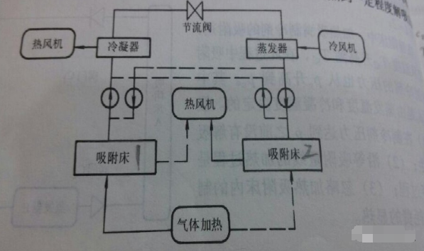吸附式制冷与吸收式制冷的原理相似,也是一种热驱动制冷方式,但以多孔固体作为吸附剂,无化学反应溶液,无需溶液泵,结构更加简单紧凑。常用的吸附工质对有:硅胶-水、分子筛-水、活性炭-甲醇等。